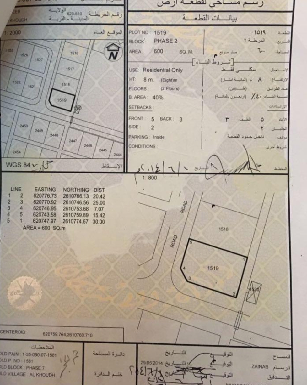 مميزات الأرض و الخدمات: مفتوحة من ثلاث جهات على شارعين وسكة ، قريب من بوابة جامعة السلطان قابوس ، موقع ممتاز بكل الخدمات.