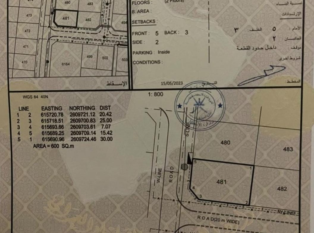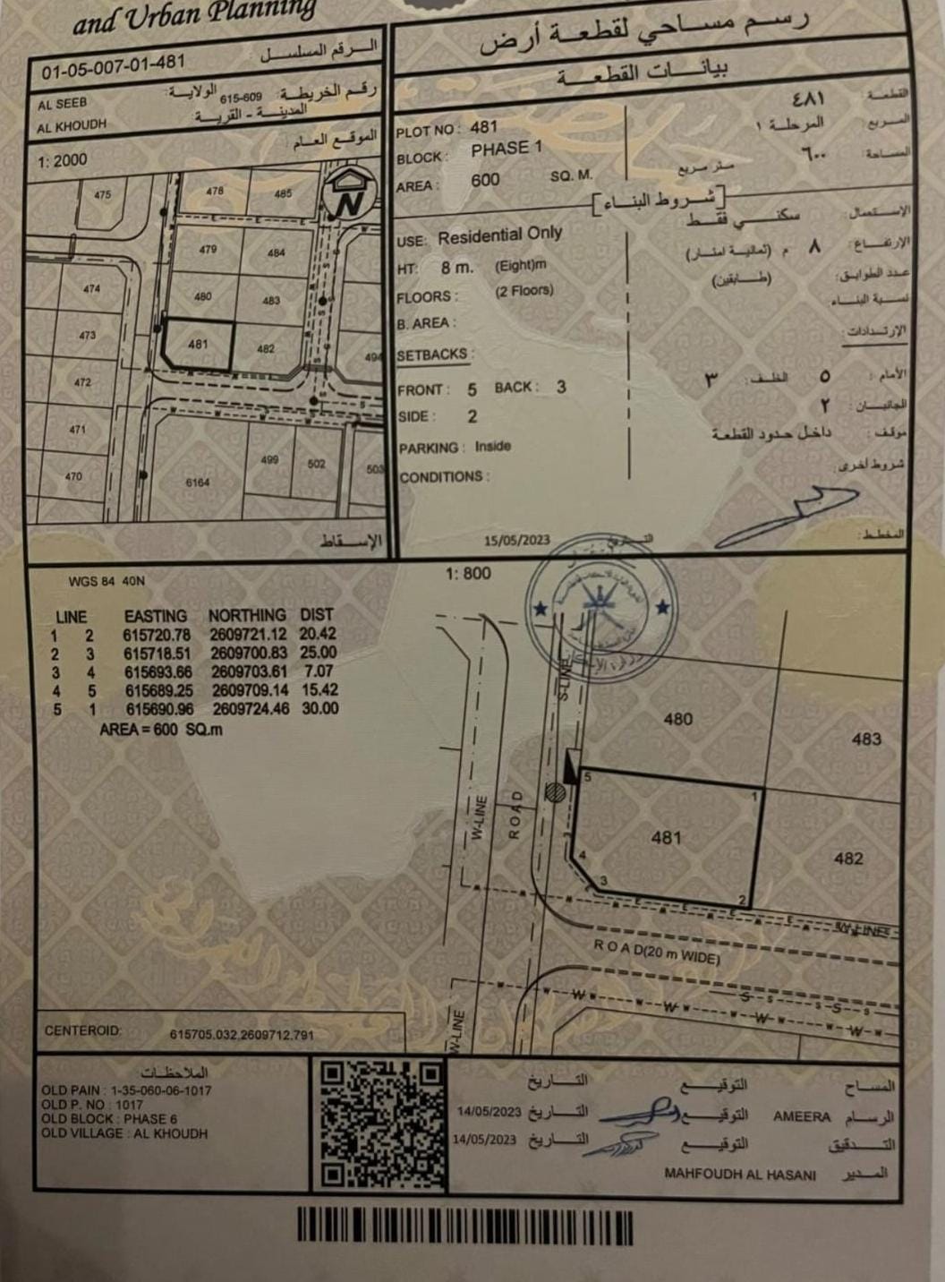مميزات الأرض و الخدمات: الخوض السادسة ،على شارعين مرصوفين ،موقع نادر ومميز قرب الوادي .
