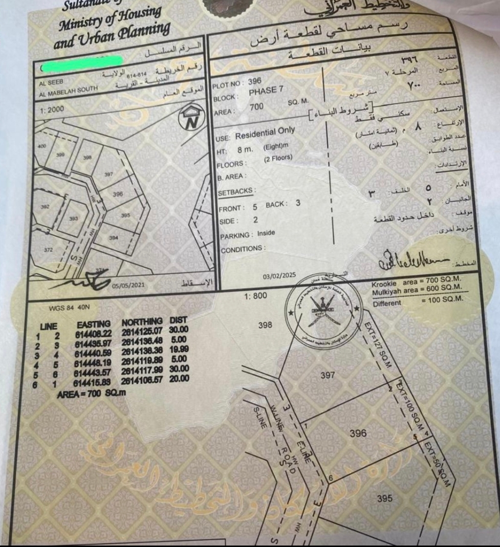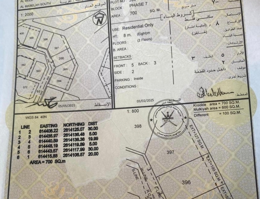 مساحة الأرض : 700 متر مربع