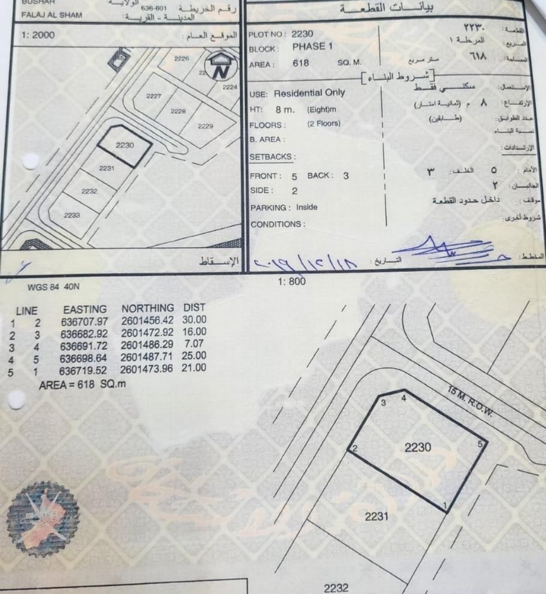 سوبر كورنر مفتوحة 3 جهات أرض بفلج الشام بوشر للبيع