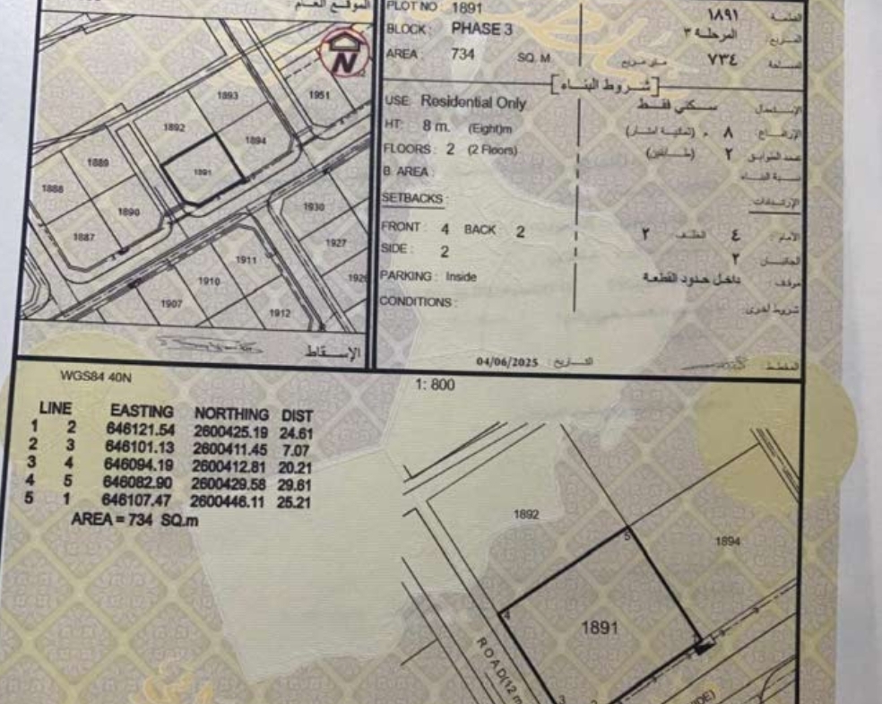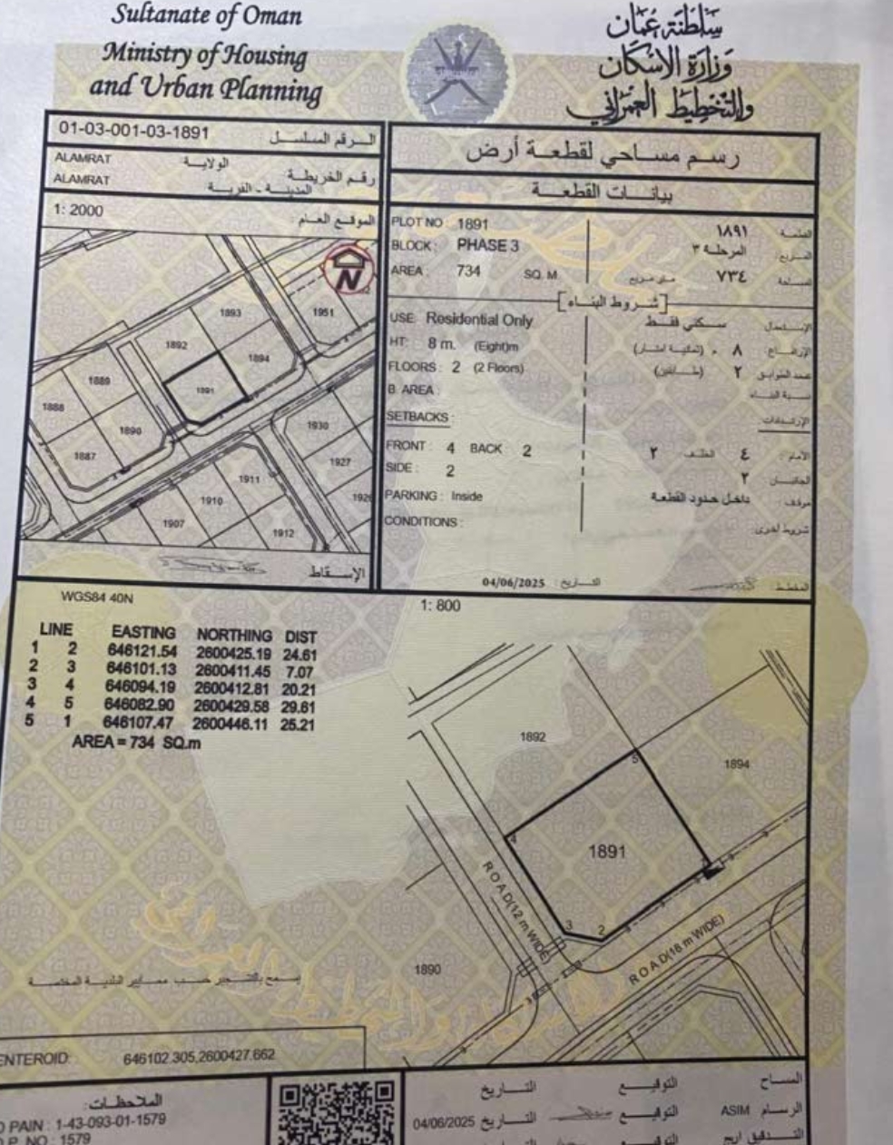 كورنر على شارعين وعرضية أرض للبيع بمرتفعات العامرات